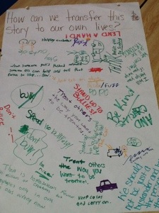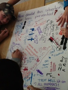 The discussion was rich. There was dissonance and it was o.k. The protocol allowed for student voices to challenge each other safely. There was affirmation as well. Students used the graffiti chart to add on to the thinking of a peer and to restate what another had written in their own words. Overall the experience was excellent! Will it make an impact on our safe school goal? Time will tell, but we have opened up an honest conversation about kindness. One student reminded us all that if we are not part of the solution, we are part of the problem. Things that make me go “hmmm” indeed!
