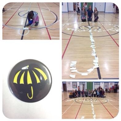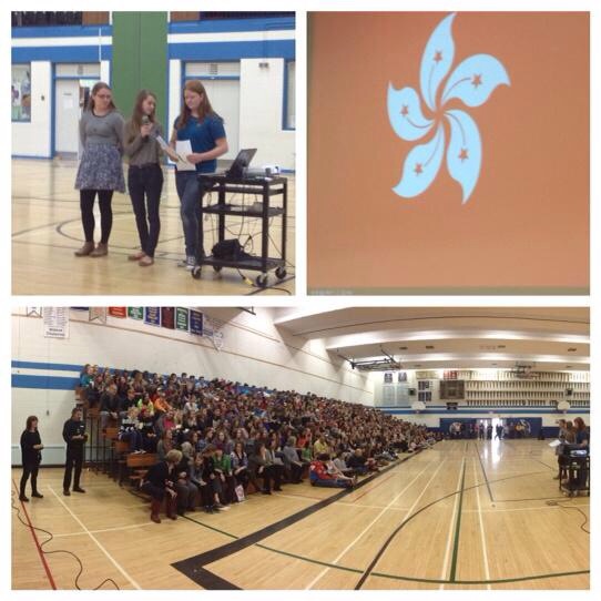 Yesterday Lizzy, Liesel and Sophia hosted a schoolwide assembly to educate their peers on the issue at hand. Students were given a yellow umbrella button to wear and one single yellow sticky note. After learning about the issue, students were invited to record a message of hope for their peers in Hong Kong and place the sticky note on a large marked umbrella on our gymnasium floor. These messages are being sent to Hong Kong today.