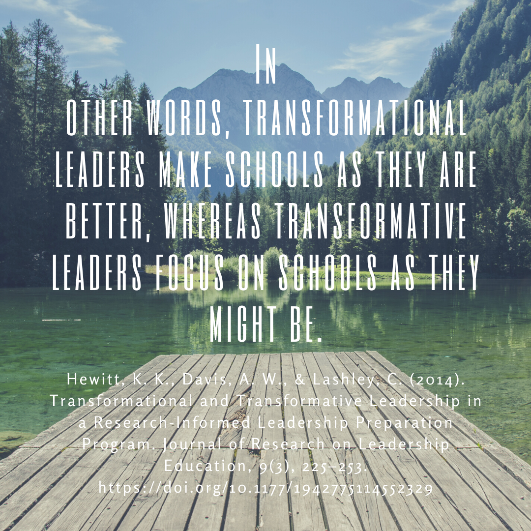 Hewitt, K. K., Davis, A. W., & Lashley, C. (2014). Transformational and Transformative Leadership in a Research-Informed Leadership Preparation Program. Journal of Research on Leadership Education, 9(3), 225–253. https://doi.org/10.1177/1942775114552329